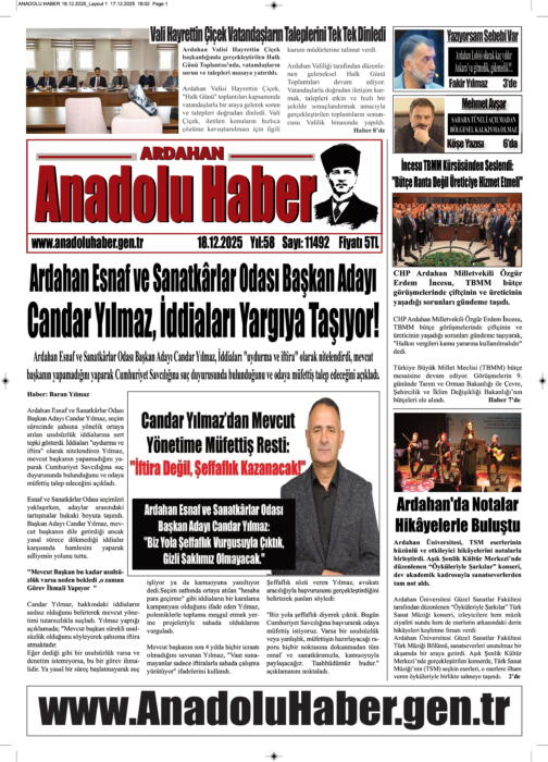 ARDAHAN’I HER GÜN YAZAN ANADOLU E-HABER GAZETESİ 18 ARALIK 2025