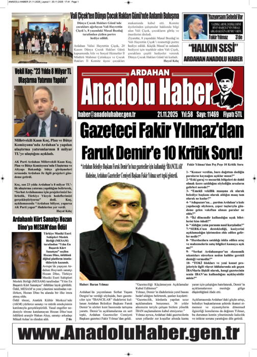 ARDAHAN’I HER GÜN YAZAN ANADOLU E-HABER GAZETESİ 17 KASIM 2025